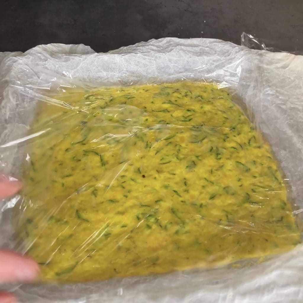 Die Zeit kann je nach Ofentyp variieren; vor dem Herausnehmen sollte sie jedoch trocken sein. Wenn sie fertig ist, nehmen Sie sie aus dem Ofen und bedecken Sie sie mit Frischhaltefolie