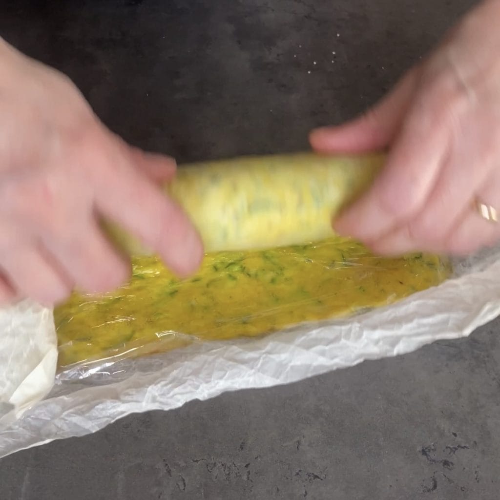 und wickeln Sie es wie ein Bonbon ein, ziehen Sie es gut fest und stellen Sie es für ein paar Stunden in den Kühlschrank, es muss kalt sein, bevor Sie es servieren.
