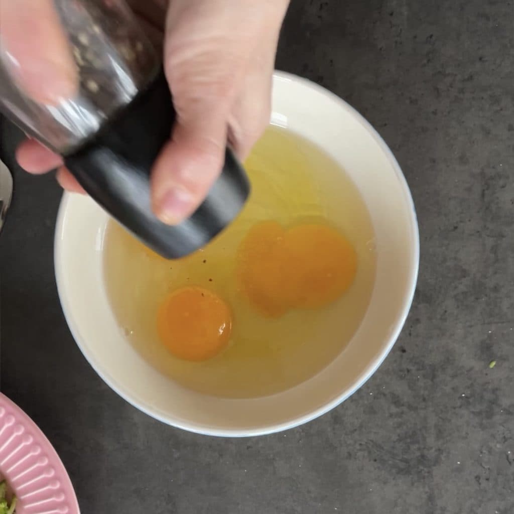 Geben Sie die Eier in eine Schüssel, fügen Sie etwas extra natives Olivenöl hinzu
