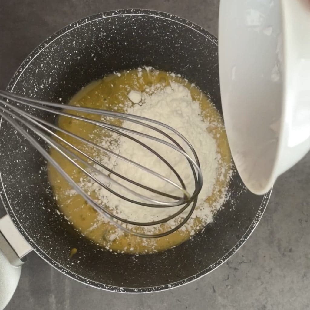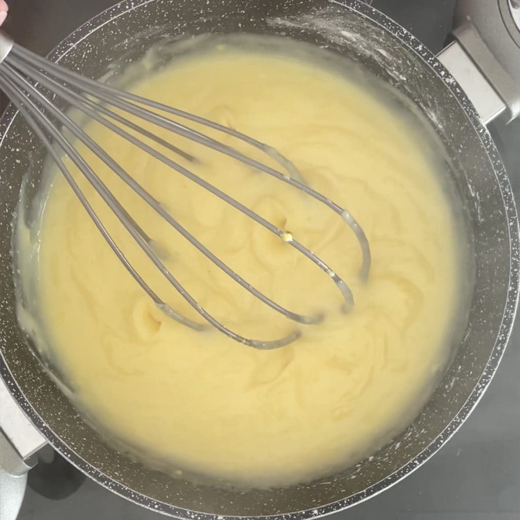 Geben Sie dann nach und nach die Milch hinzu und rühren Sie ständig, damit keine Klumpen entstehen und eine glatte und homogene Mischung entsteht,