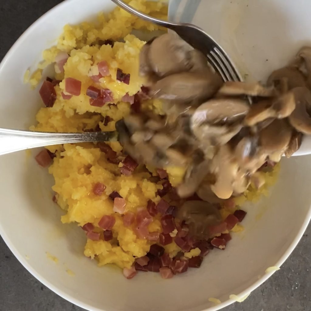 • Beginnen wir mit der Zubereitung des Kartoffel- und Pilzbratens. Kochen Sie die Kartoffeln und prüfen Sie die Garstufe, indem Sie die Zinken einer Gabel einstechen. Wenn sie leicht hineingehen, sind die Kartoffeln gar. Bereiten Sie die Pilze vor, reinigen Sie sie, waschen Sie sie schnell unter fließendem Wasser ab und schneiden Sie sie in kleine Stücke.