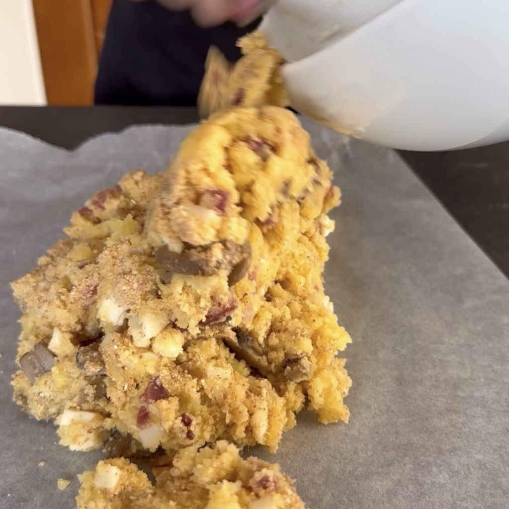 • und drücken Sie es gut zusammen, indem Sie das Backpapier verwenden und formen Sie es zu einer Rolle.