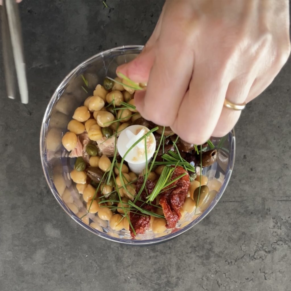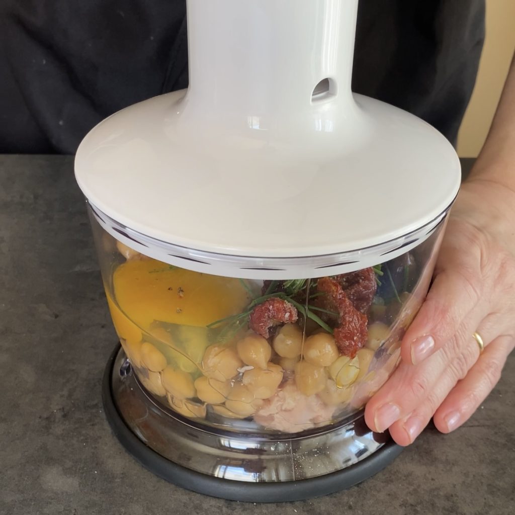 Beginnen wir mit der Zubereitung der Kichererbsen- und Thunfischfrikadellen. Geben Sie die Zutaten in den Mixer-Becher, den Thunfisch,