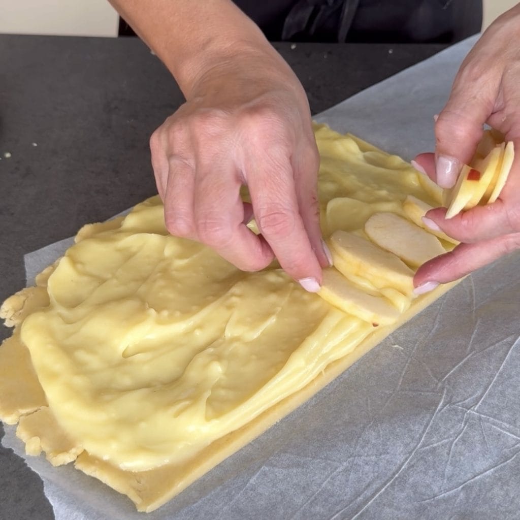 Kuchen mit Creme und Äpfeln ein Kuchen aus Mürbeteig, ein rustikales Dessert, das ich liebe und das meine Großmutter immer für mich gemacht hat, perfekt zu jeder Tageszeit, zum Frühstück, als Snack oder als Dessert, perfekt auch für ein Buffet. Wenn Sie diesen Kuchentyp mögen, probieren Sie auch die APFELTARTE MIT GROßMUTTER’S CREME, die auch sehr lecker und einfach zuzubereiten ist. Lassen Sie uns nun sehen, wie man den Kuchen mit Creme und Äpfeln zubereitet, und wenn Sie ihn probieren, lassen Sie es mich wissen. Barbara