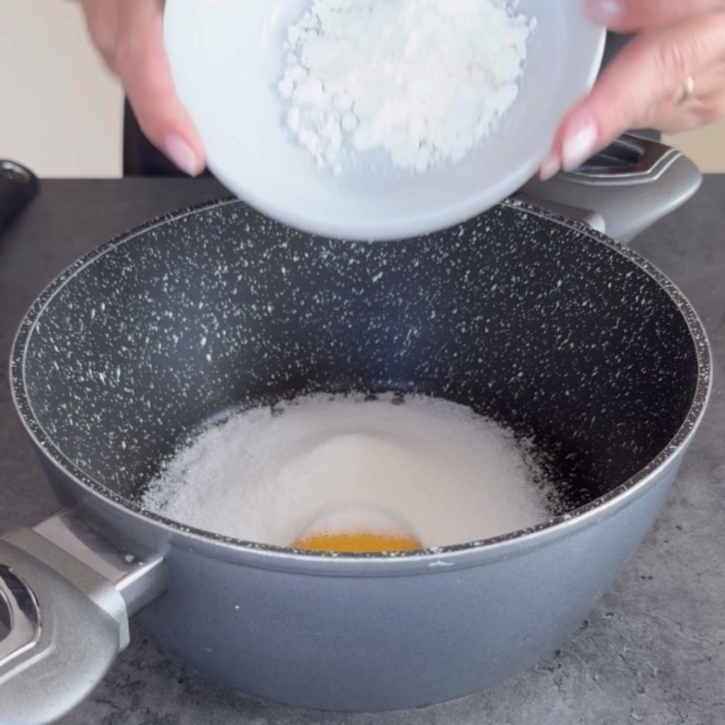 Beginnen wir mit der Zubereitung des Kuchens mit Creme und Äpfeln, zunächst die Vanillepudding-Creme zubereiten, das Eigelb in einen Topf geben,