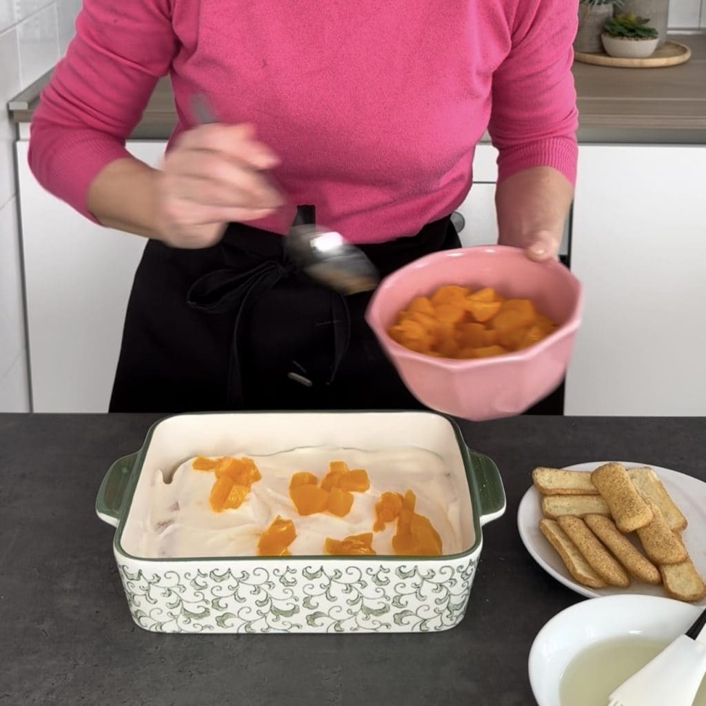 Decken Sie die Auflaufform mit Frischhaltefolie ab und lassen Sie den Kuchen mit eingelegten Pfirsichen und Joghurt 6 Stunden im Kühlschrank ruhen, bevor Sie ihn servieren.