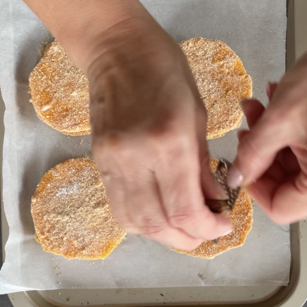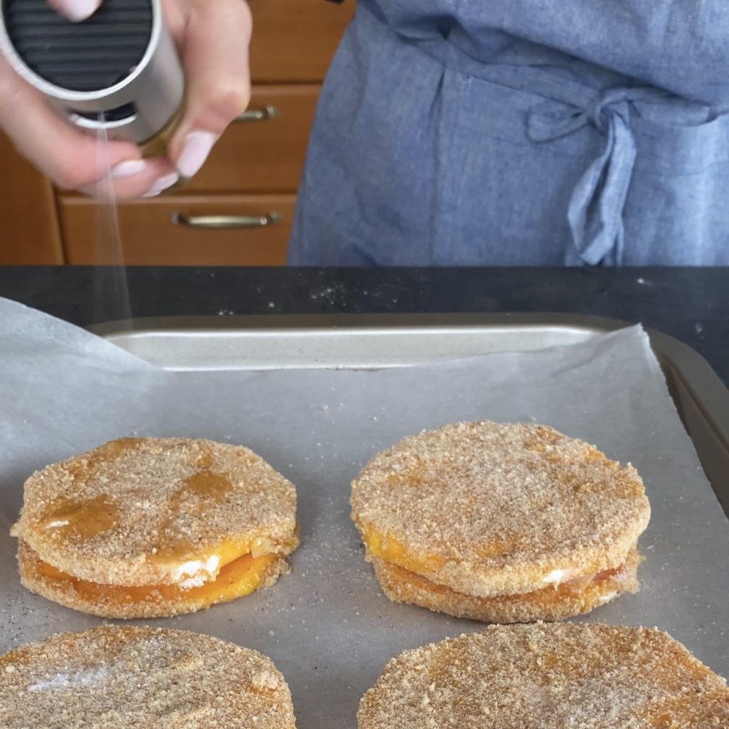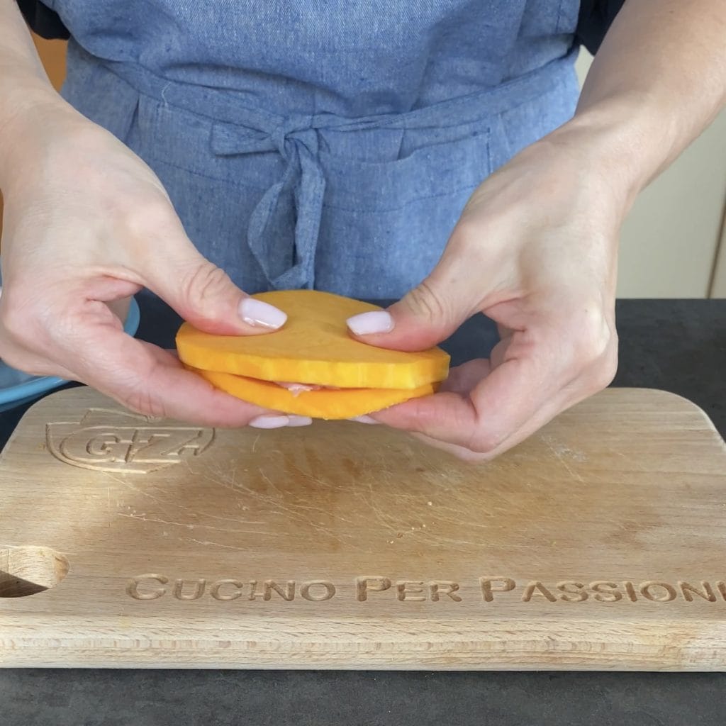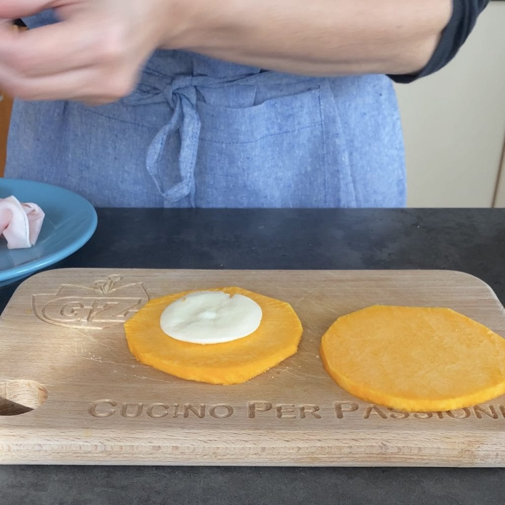 • Decken Sie es mit der zweiten Kürbisscheibe ab und drücken Sie gut. Fahren Sie auf diese Weise fort, um die anderen Kürbis-Cordon-Bleu herzustellen.