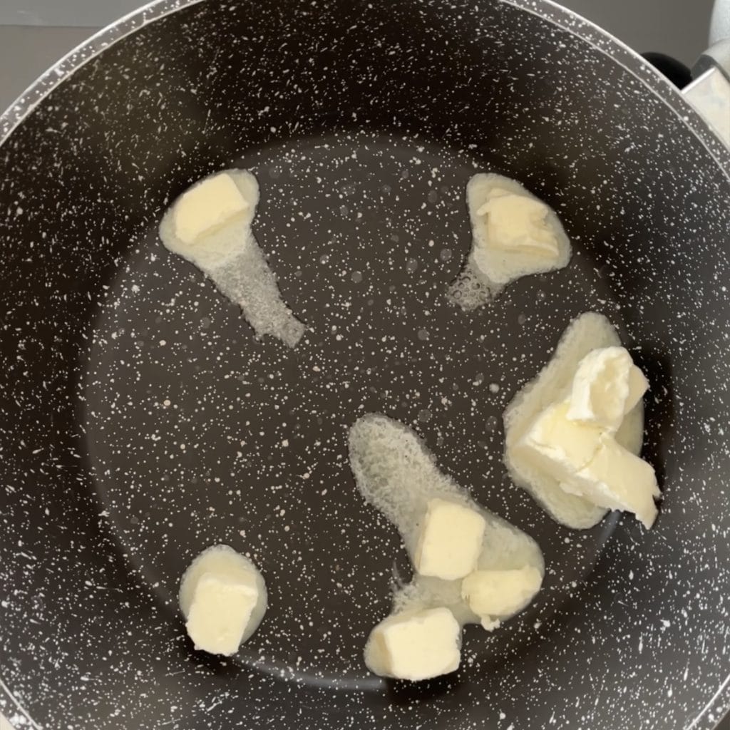 Wenn die Butter geschmolzen ist, fügen Sie das Mehl auf einmal hinzu, rühren Sie mit dem Schneebesen um und lassen Sie es ein paar Minuten unter ständigem Rühren auf dem Herd stehen.