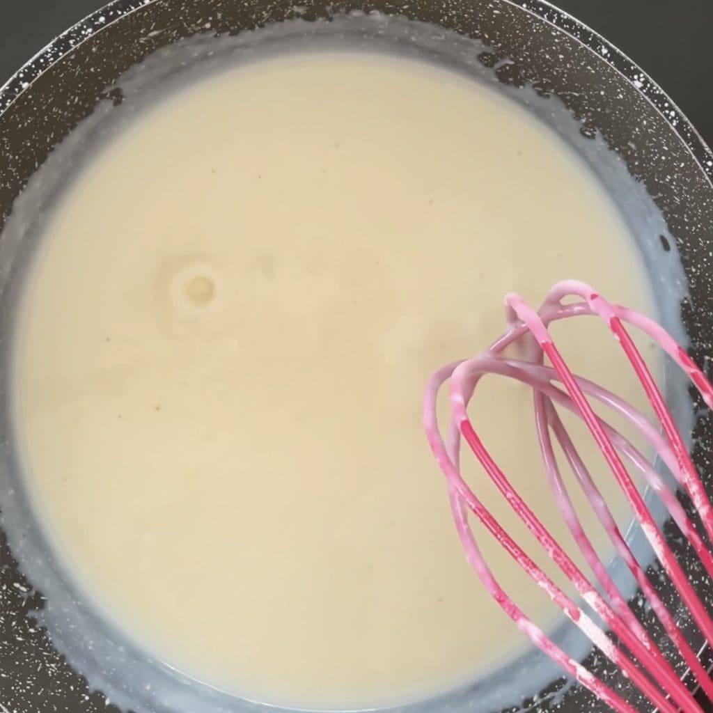 Nehmen Sie den Topf vom Herd, geben Sie nach und nach die Milch hinzu und rühren Sie weiter, um Klumpen zu vermeiden.