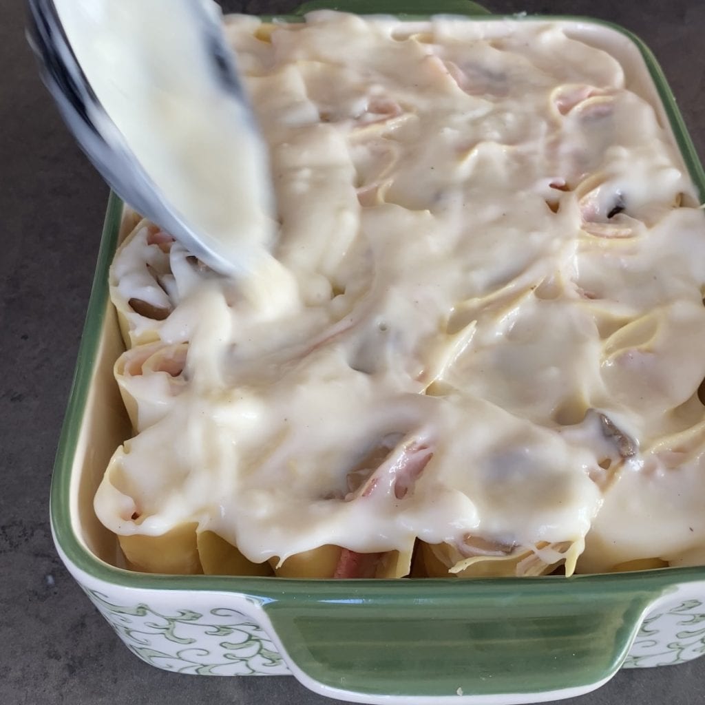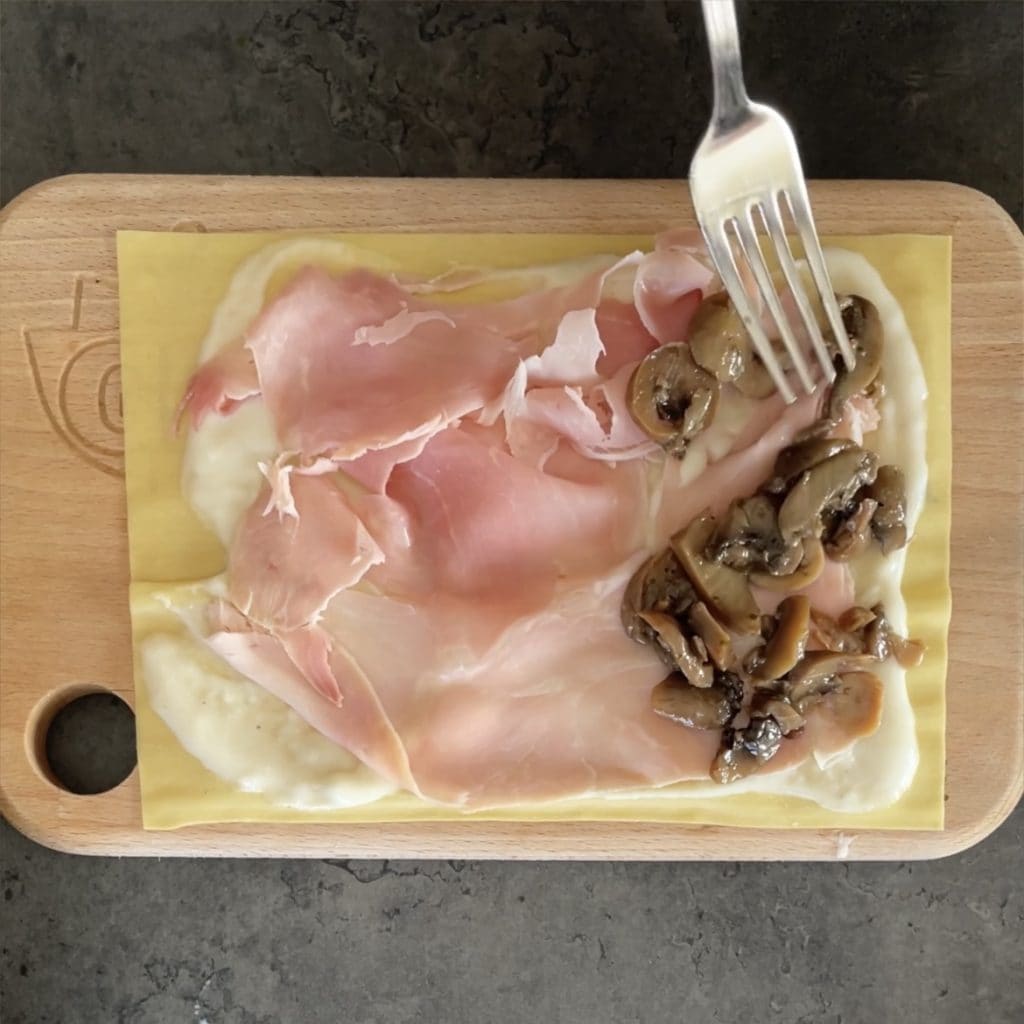 Wie man die Lasagne-Rollen mit Schinken und Pilzen zubereitet