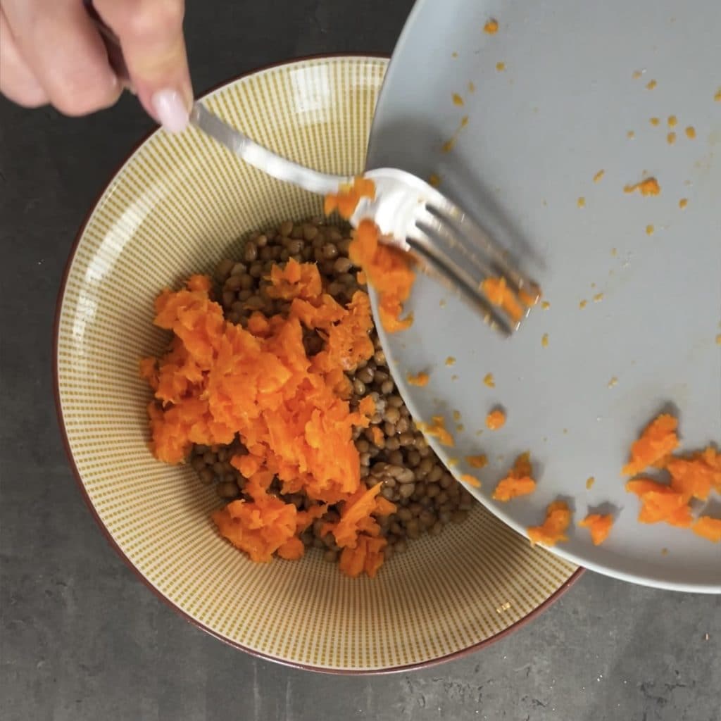 • Geben Sie die gekochten Linsen und die zerdrückte Karotte in eine Schüssel,
