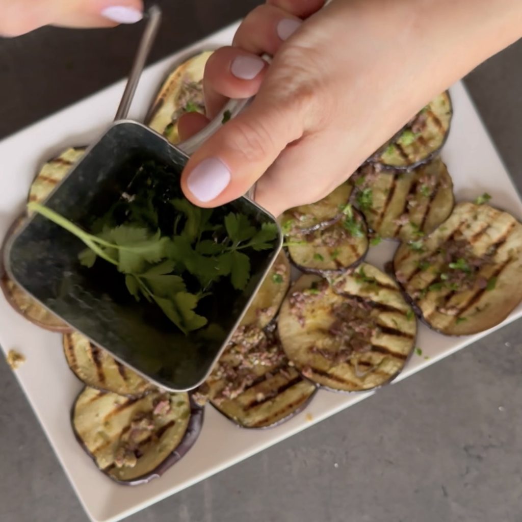 Würzt die gegrillten Auberginenscheiben mit dem Dressing,