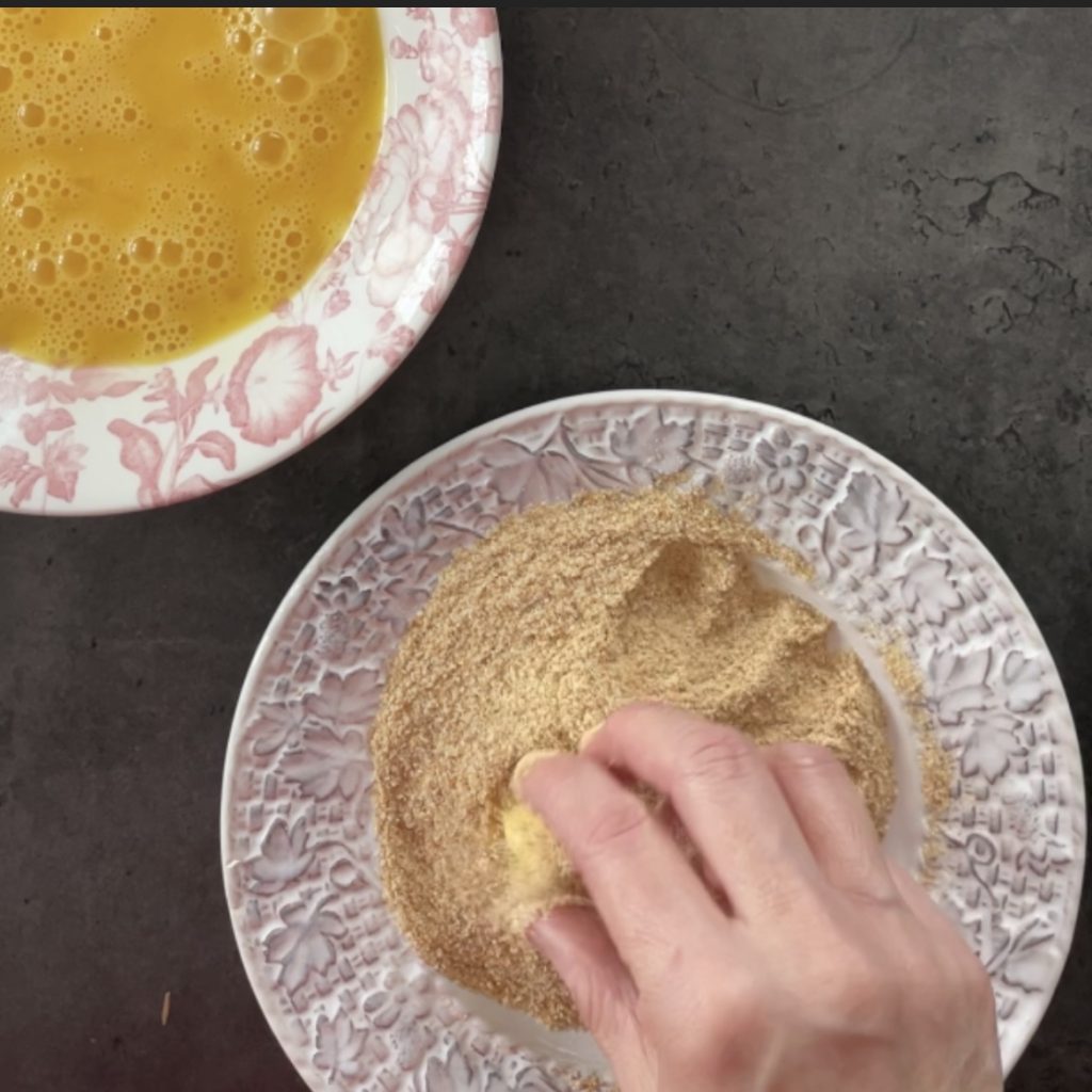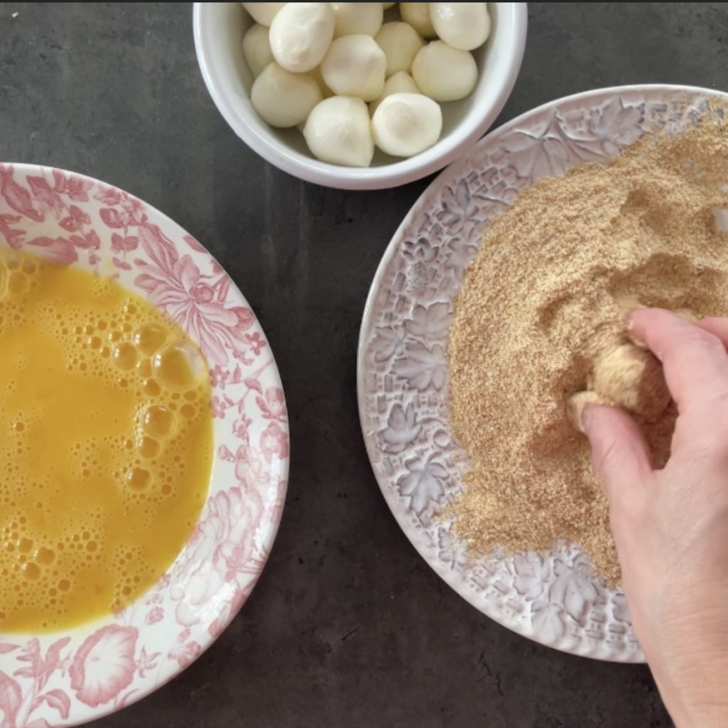 und abschließend erneut in Paniermehl wenden. Durch diese doppelte Panade werden die Mozzarella außen knusprig und innen schön zart und fädenziehend.