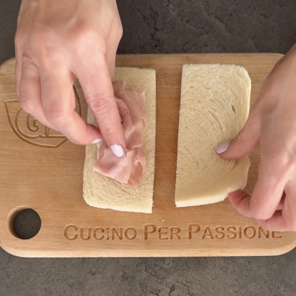 • Beginnen Sie mit der Zubereitung der Mozzarella in Kutsche im Ofen, indem Sie die Weißbrotscheiben halbieren,
