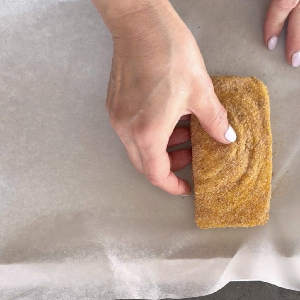 • Legen Sie sie während der Zubereitung auf das Backblech, das Sie mit Backpapier ausgelegt haben, und sprühen Sie etwas Olivenöl darauf.