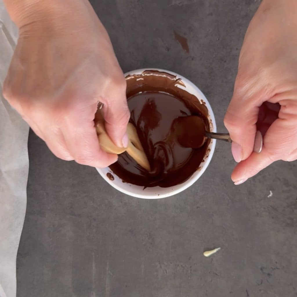 Die Masken in die Schokolade tauchen und dann die überschüssige Schokolade abtropfen lassen,