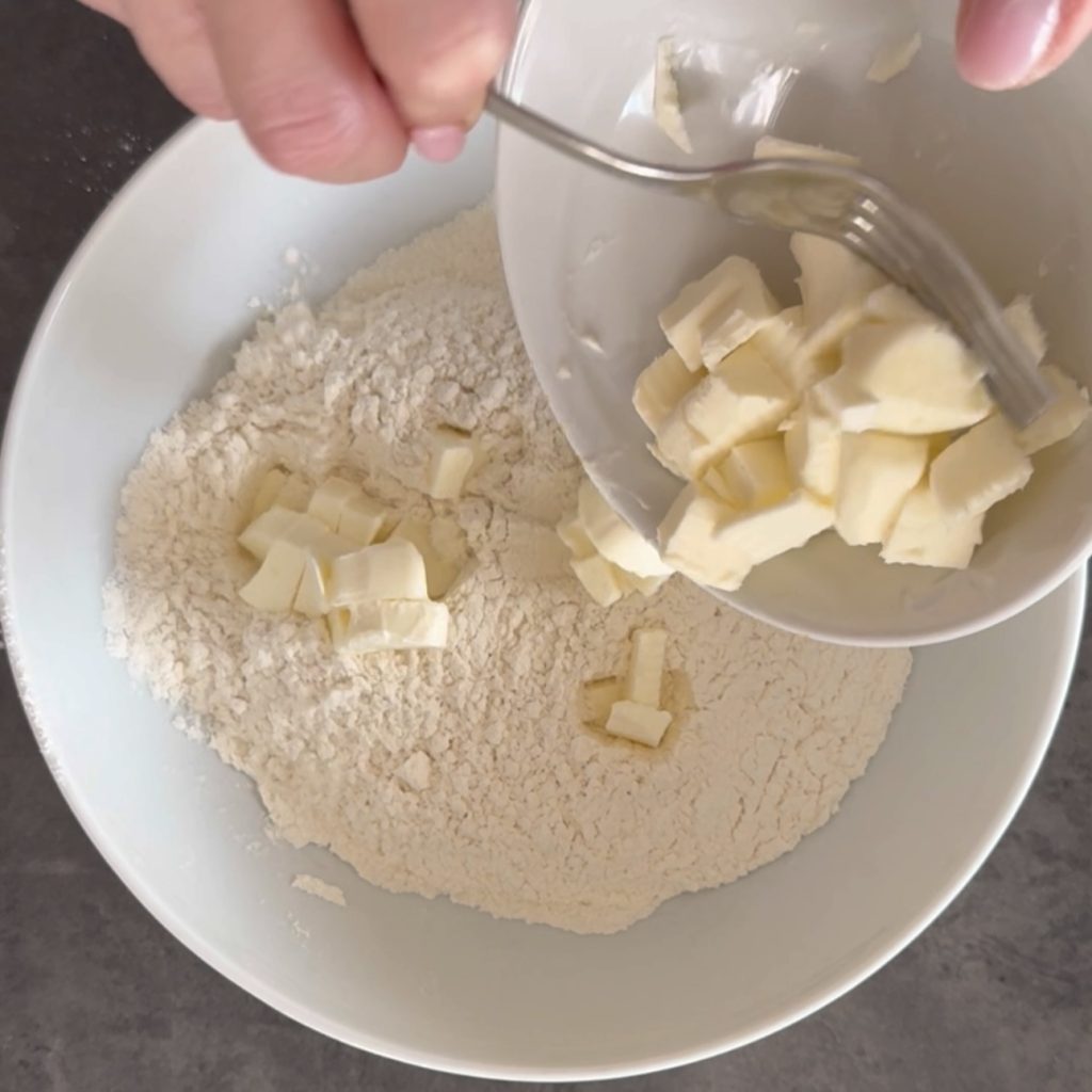 die kalte Butter aus dem Kühlschrank und in kleine Stücke geschnitten,