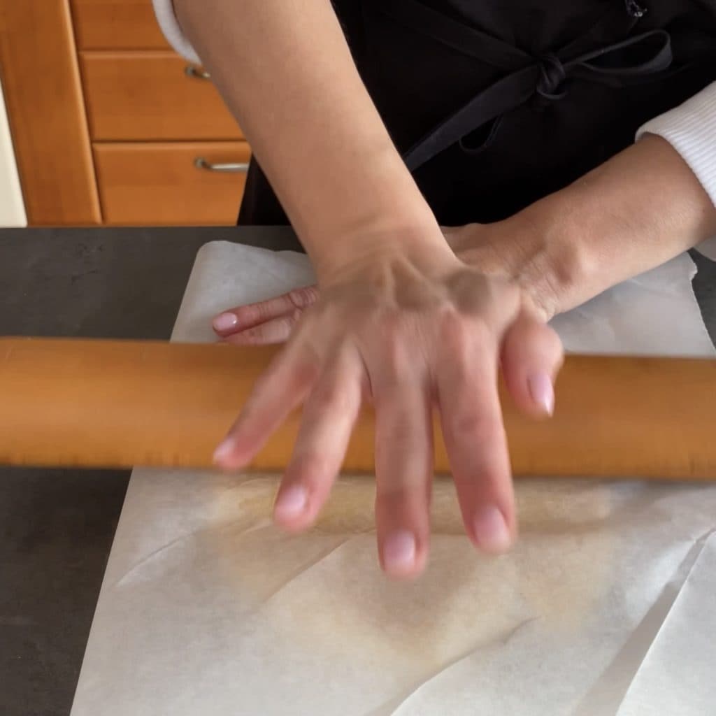 Dann zwischen zwei Backpapierblätter legen und mit dem Nudelholz ausrollen, 30 Minuten im Kühlschrank ruhen lassen.