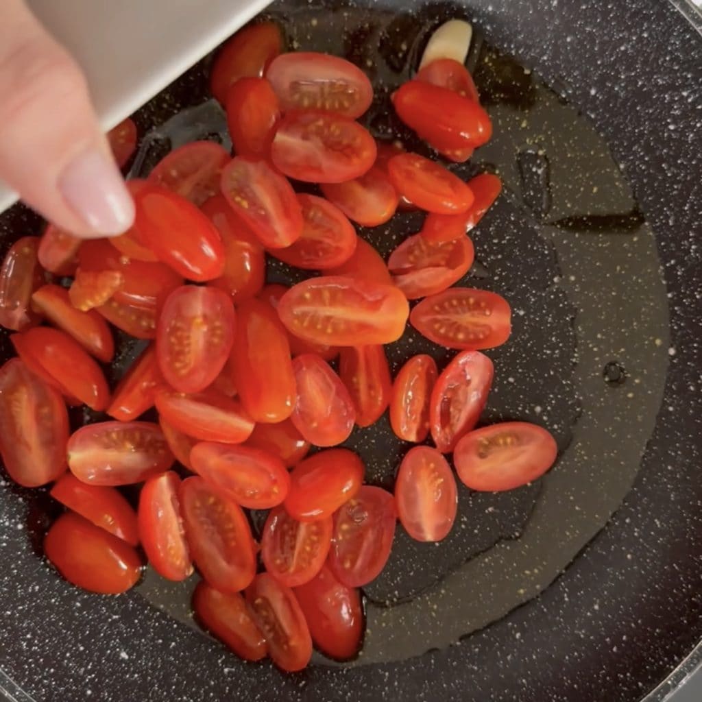 Gebt in eine große Pfanne etwas extra natives Olivenöl, eine halbierte Knoblauchzehe und die Kirschtomaten,