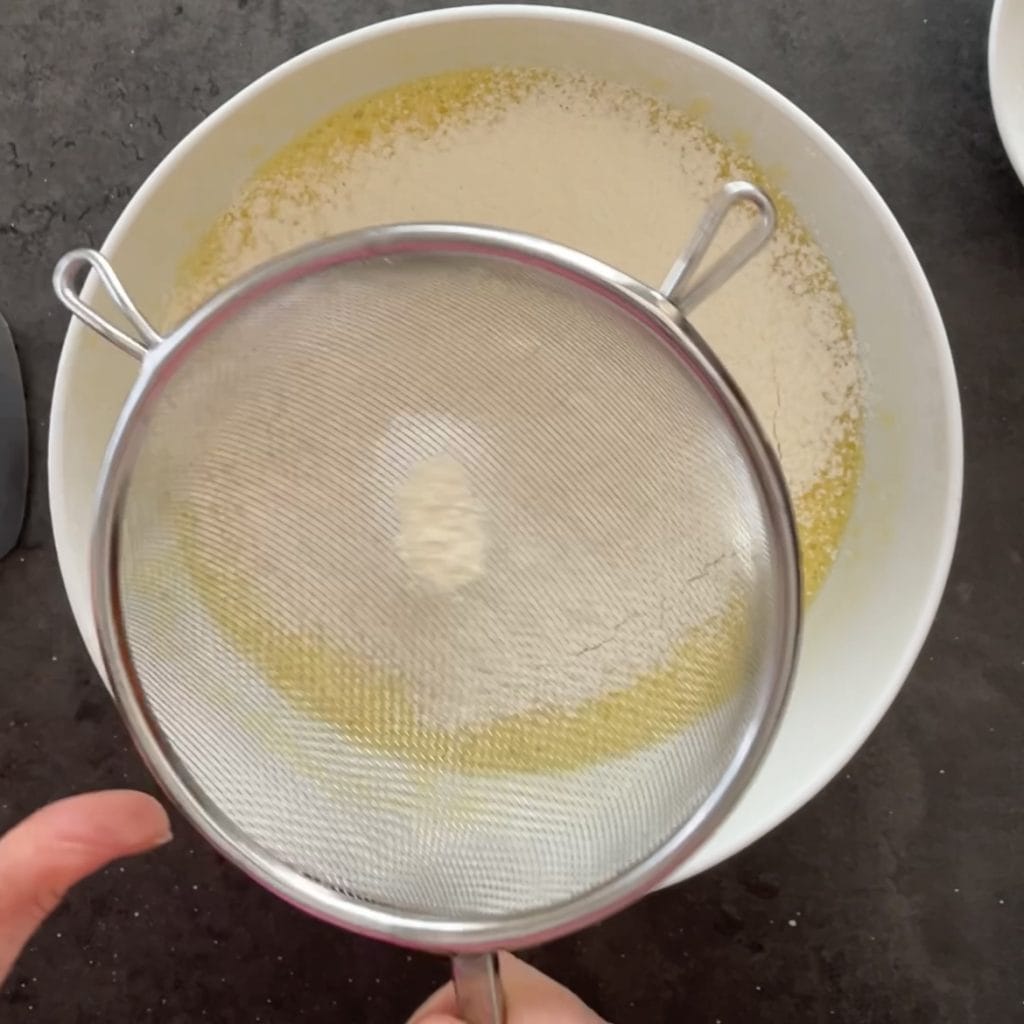 Das gesiebte Mehl und die Maisstärke hinzufügen und mit einem Spatel von oben nach unten vorsichtig unterheben, damit die Masse nicht zusammenfällt.