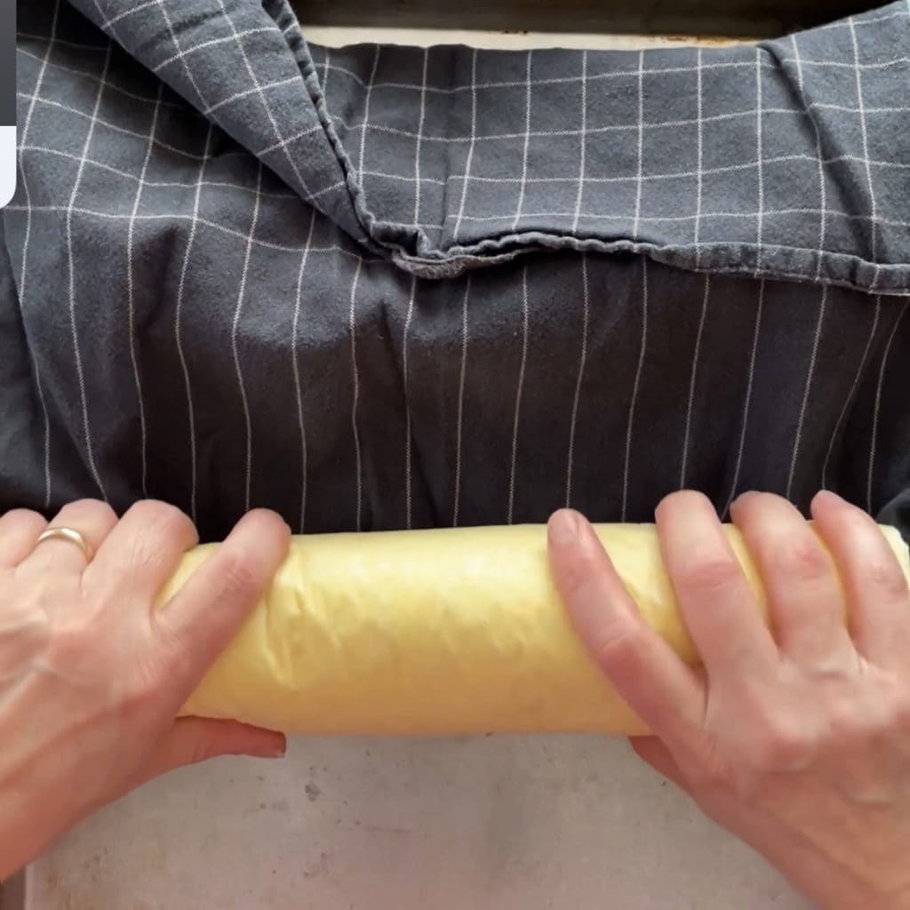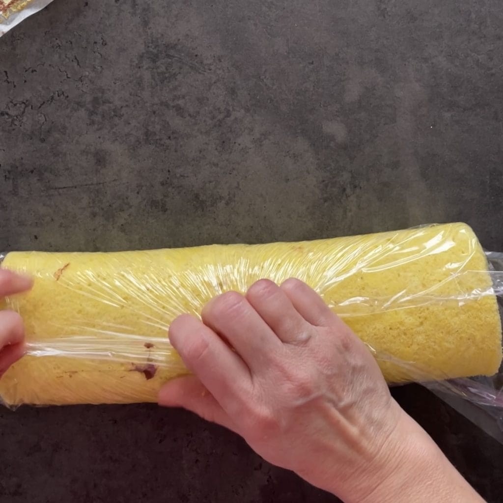 Wenn die Biskuitrolle fertig ist, aus dem Ofen nehmen, mit einem sauberen Küchentuch abdecken und aufrollen, bei Raumtemperatur abkühlen lassen.