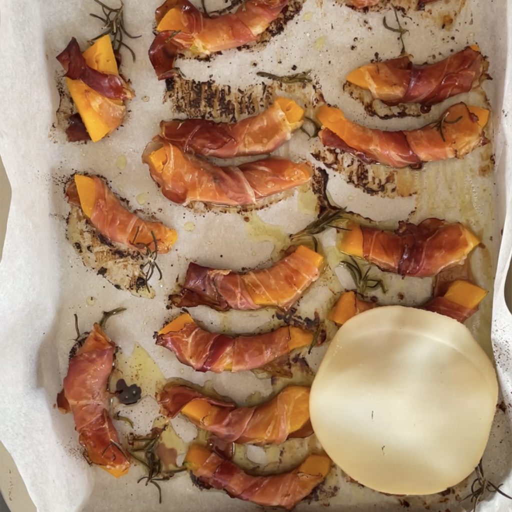 Nehmen Sie die Kürbisscheiben und wickeln Sie sie mit Speck ein.