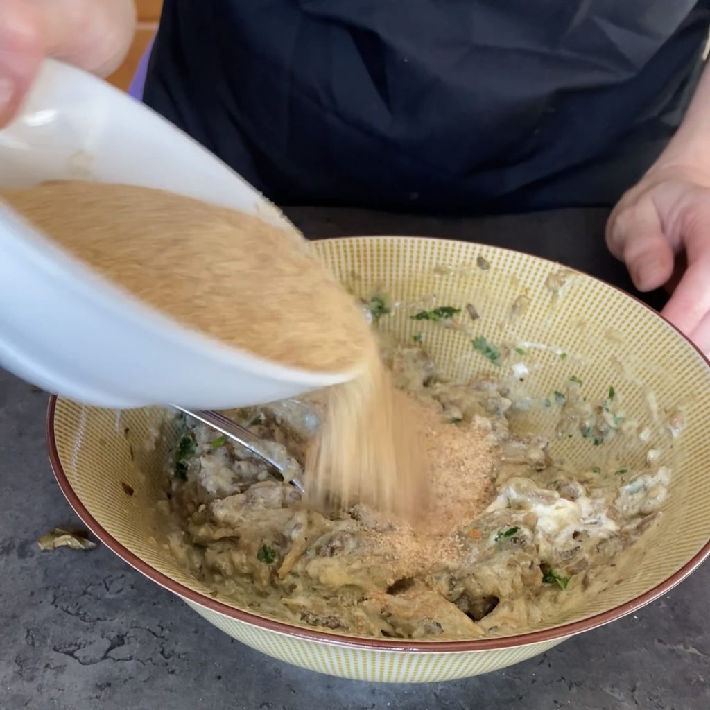 Nehmen Sie einen Teil der Mischung und formen Sie Frikadellen, die Sie im Paniermehl wälzen.