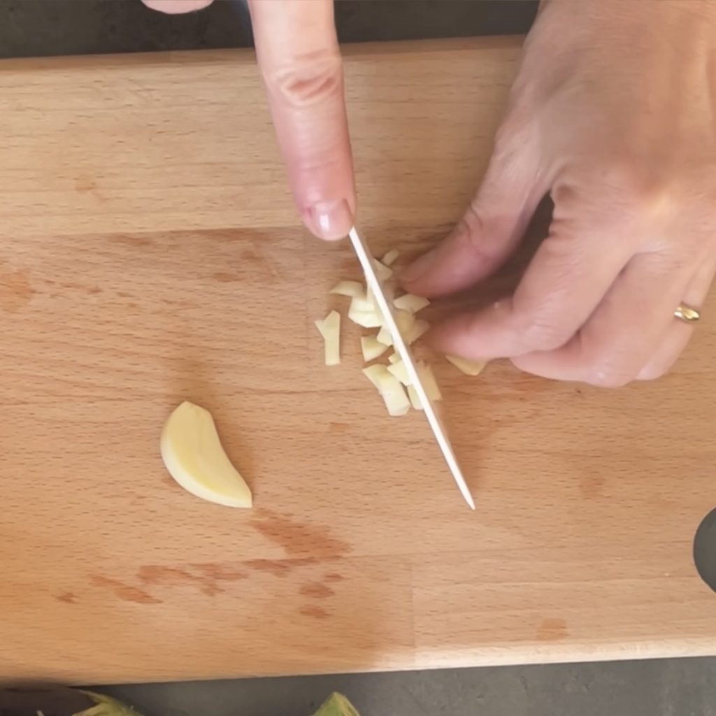 Wir beginnen mit der Zubereitung der Auberginenfrikadellen, indem wir den Knoblauch fein hacken,