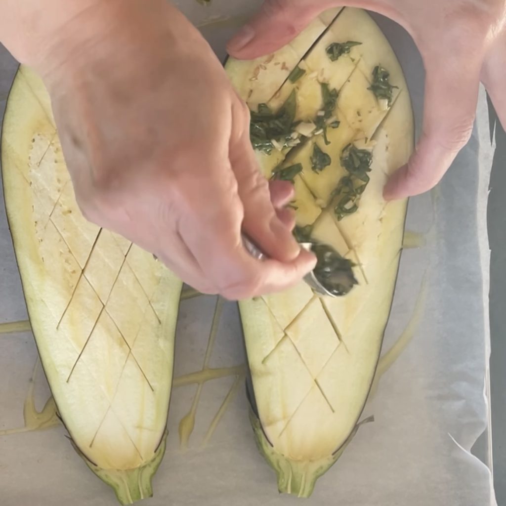 legen Sie ein Backblech mit Backpapier aus und legen Sie die Auberginen darauf, geben Sie Öl und die Mischung aus Knoblauch, Petersilie und Basilikum auf die Auberginen, indem Sie die Schnitte erweitern, damit die Würze in die Schnitte der Auberginen eindringen kann.