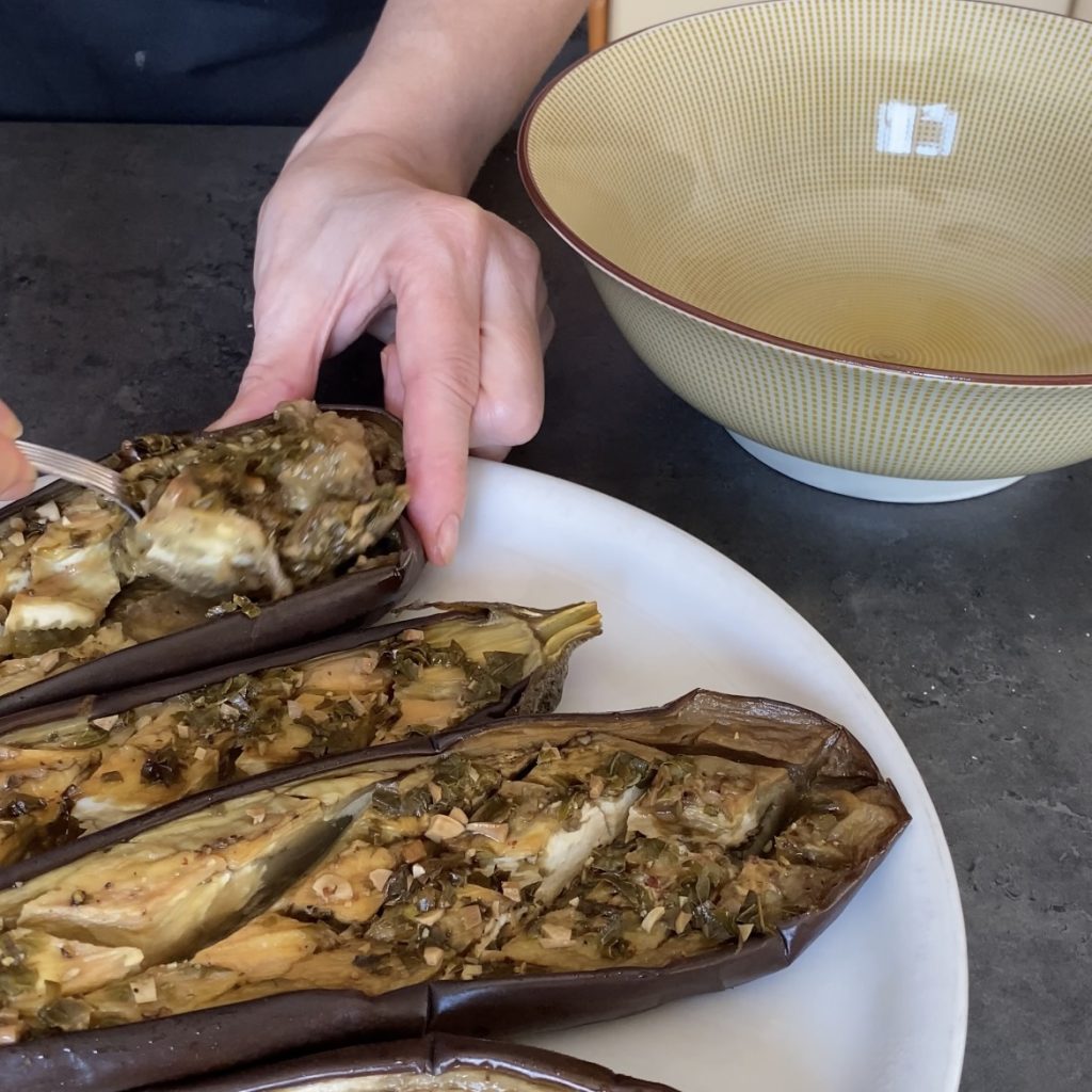 Wenn die Auberginen gekocht sind und das Fruchtfleisch weich ist, nehmen Sie sie aus dem Ofen und lassen Sie sie abkühlen, Sie können die Auberginen auch am Vortag zubereiten. Nehmen Sie mit einem Löffel das Fruchtfleisch aus den Auberginen,