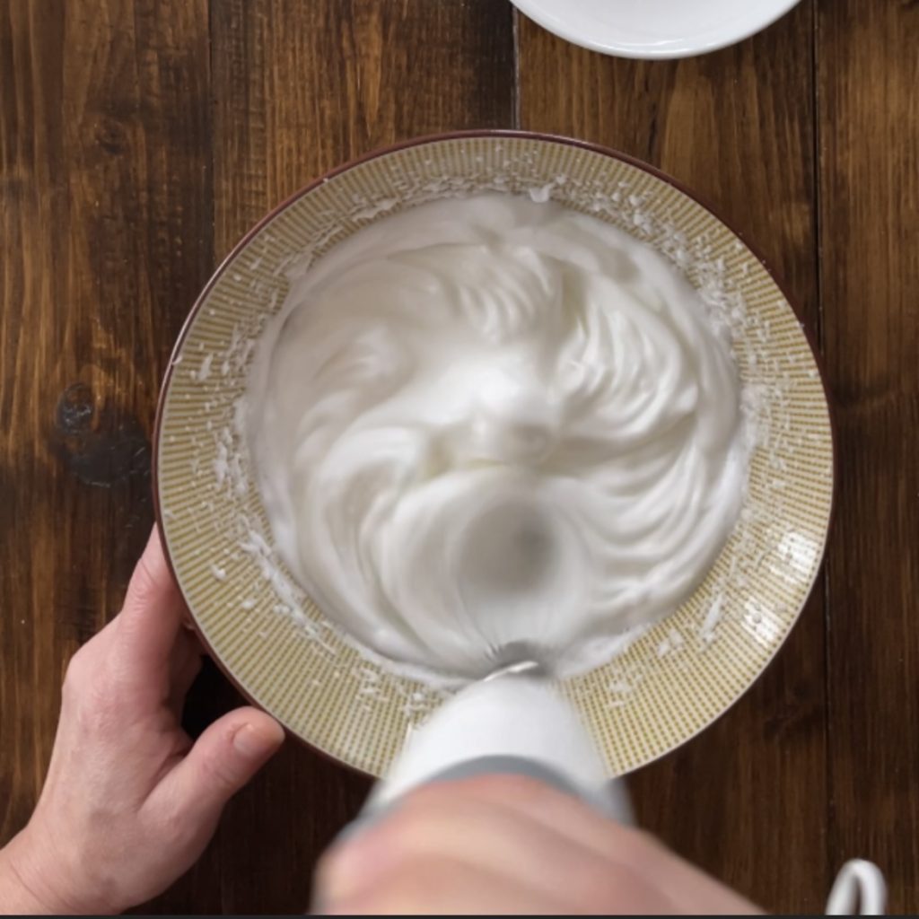 • Wenn die Mischung glatt und homogen ist, geben Sie das geschlagene Eiweiß hinzu und lassen Sie es mit Bewegungen von oben nach unten einziehen, damit es nicht zusammenfällt. Sie erhalten eine sehr cremige Mischung.