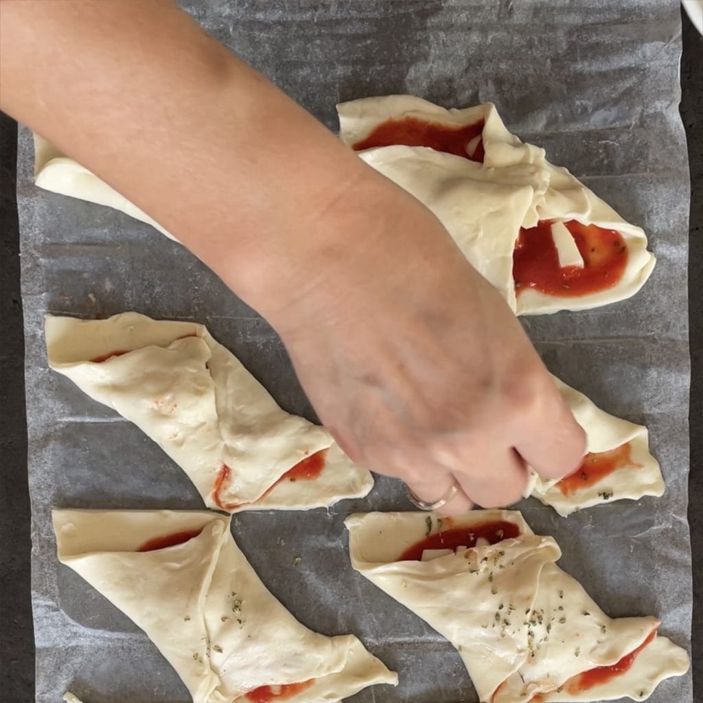 Die Pizzakannolen auf das Backblech legen und mit Oregano bestreuen.
