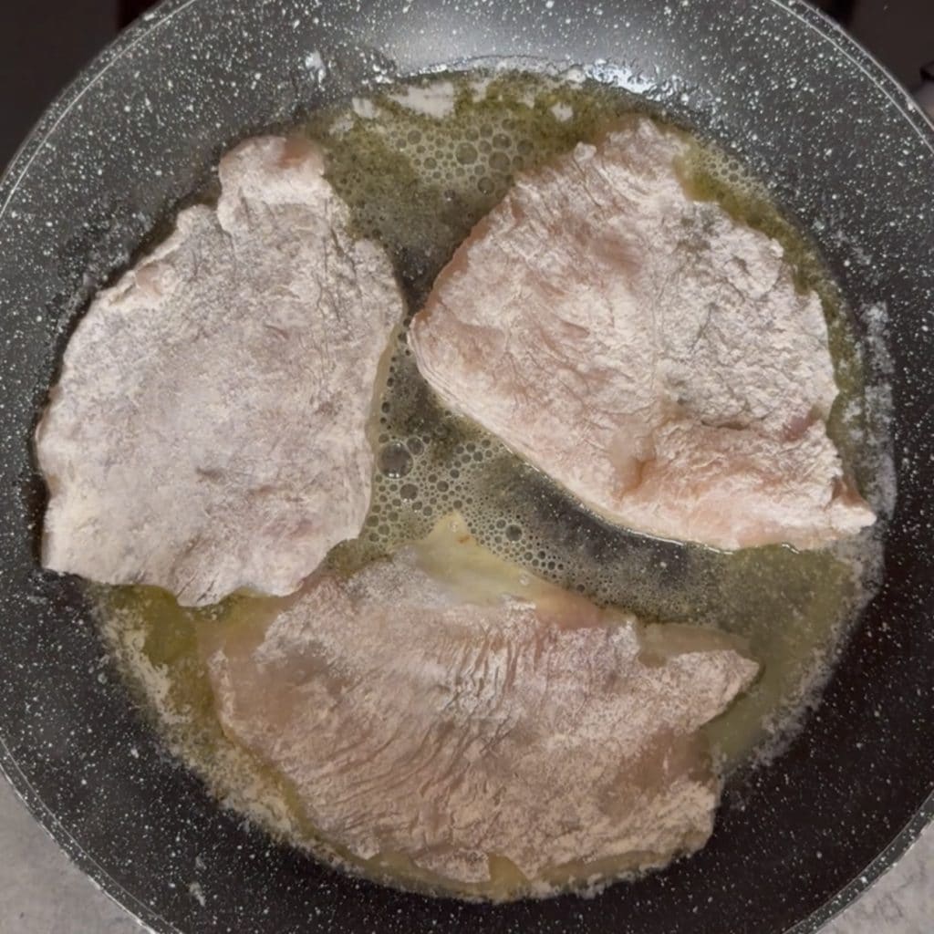 Die Putenfilets im Mehl wenden und beiseite stellen.