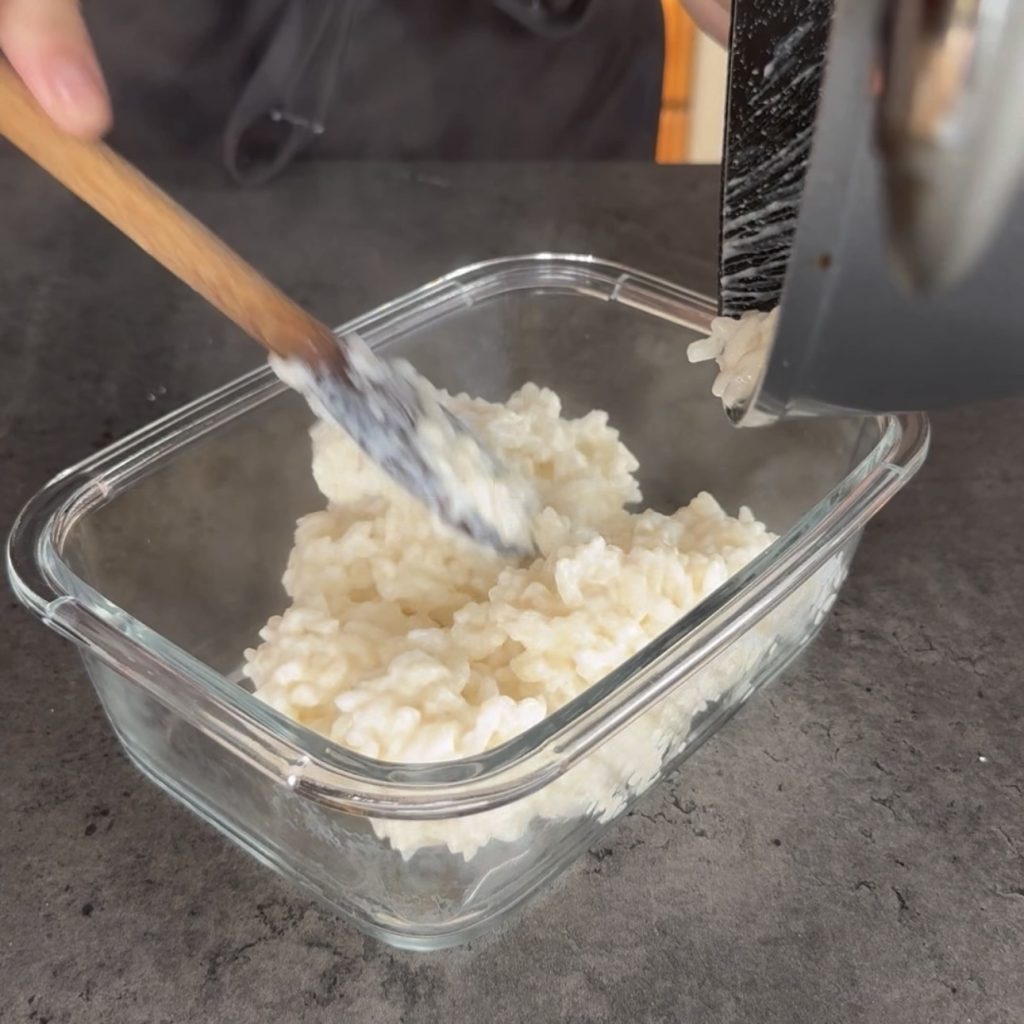 Wenn der Reis fertig ist, in eine Schüssel oder auf einen Teller geben und abkühlen lassen.