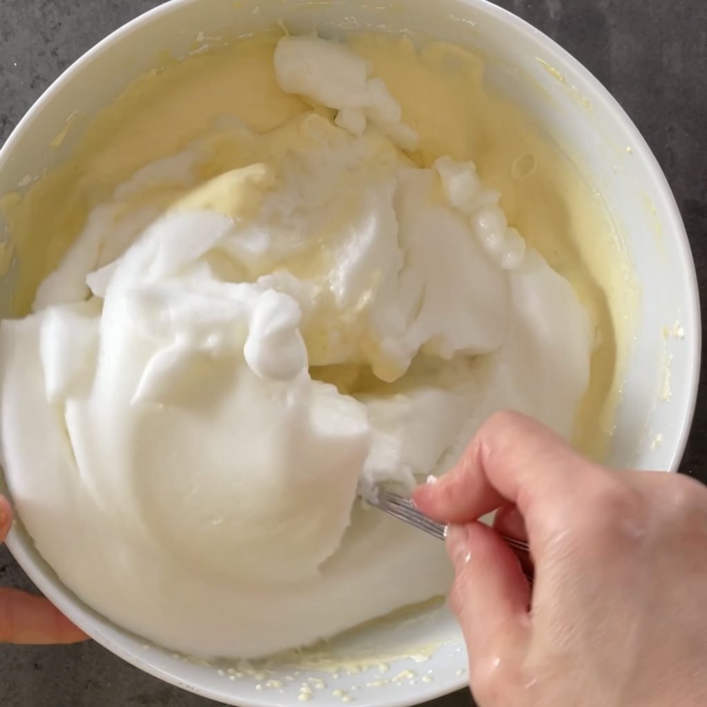 Fügen Sie das steifgeschlagene Eiweiß hinzu und heben Sie es mit Bewegungen von oben nach unten vorsichtig unter, um die Mischung nicht zu entlüften