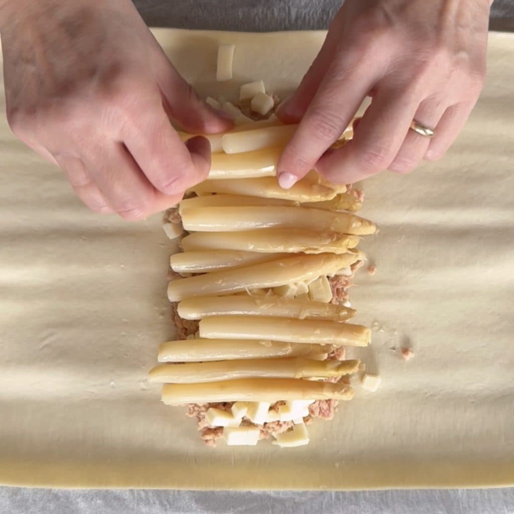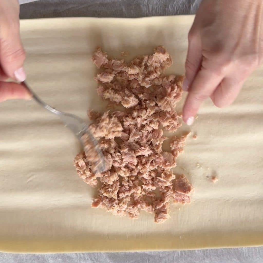 • Rollen Sie den Blätterteig aus, legen Sie die lange Seite vor sich, legen Sie den Thunfisch in die Mitte,