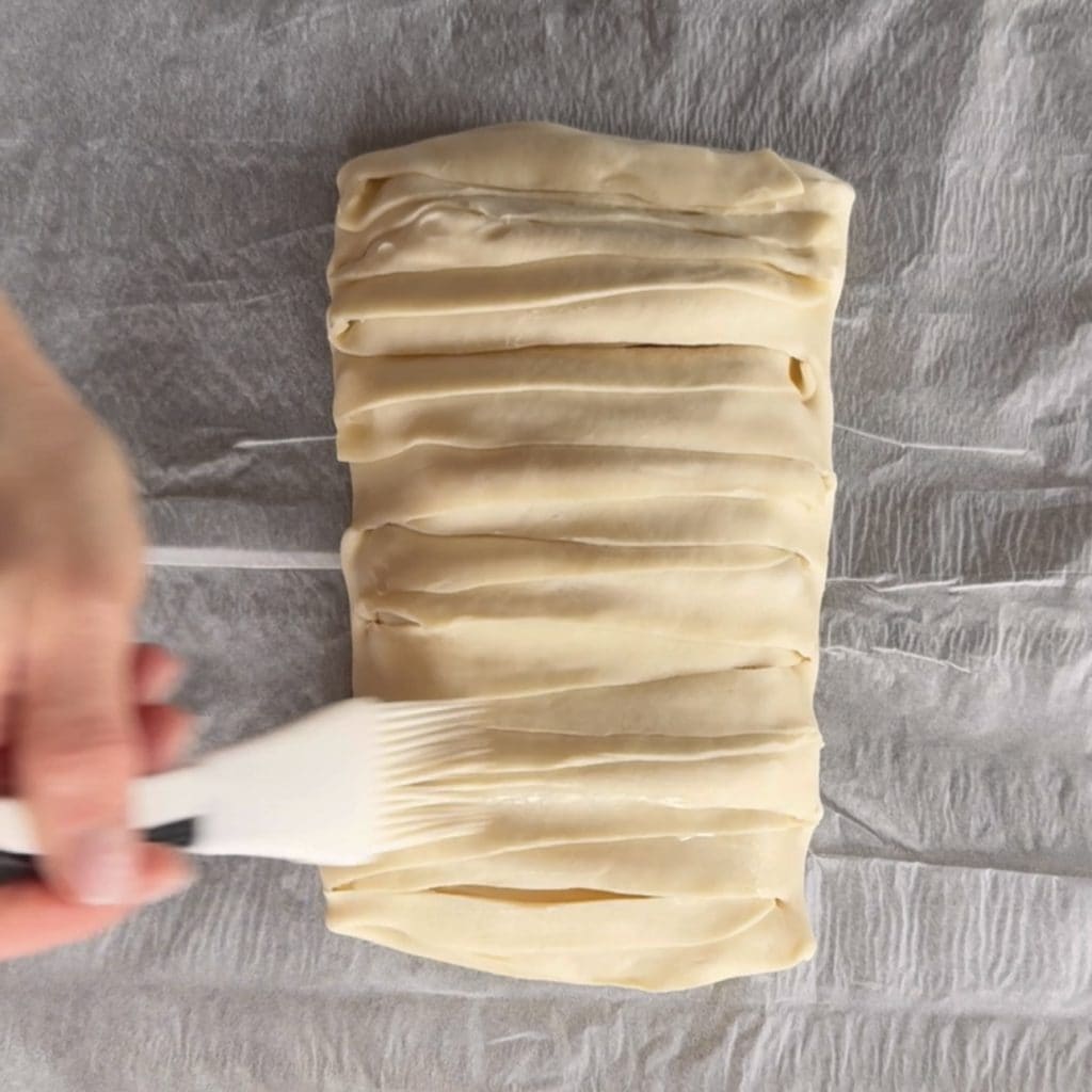 • Machen Sie mit einem scharfen Messer an den Seiten des Blätterteigs Einschnitte auf beiden Seiten, um 1 cm breite Streifen zu erhalten, wobei Sie den mittleren Teil, in dem die Füllung liegt, unberührt lassen.