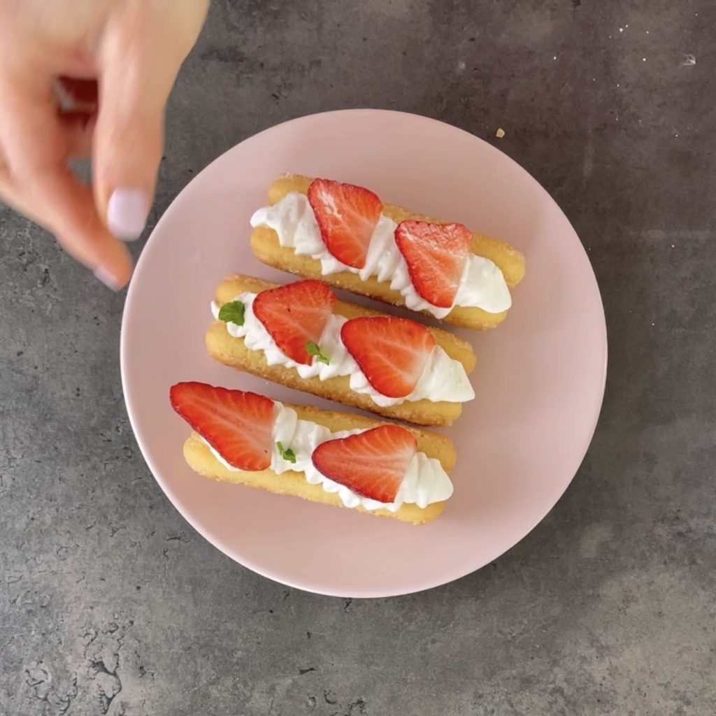 und legen Sie die Savoiardi auf ein Tablett oder einen Teller mit der Verbindung nach oben, fügen Sie darauf noch geschlagene Sahne hinzu.