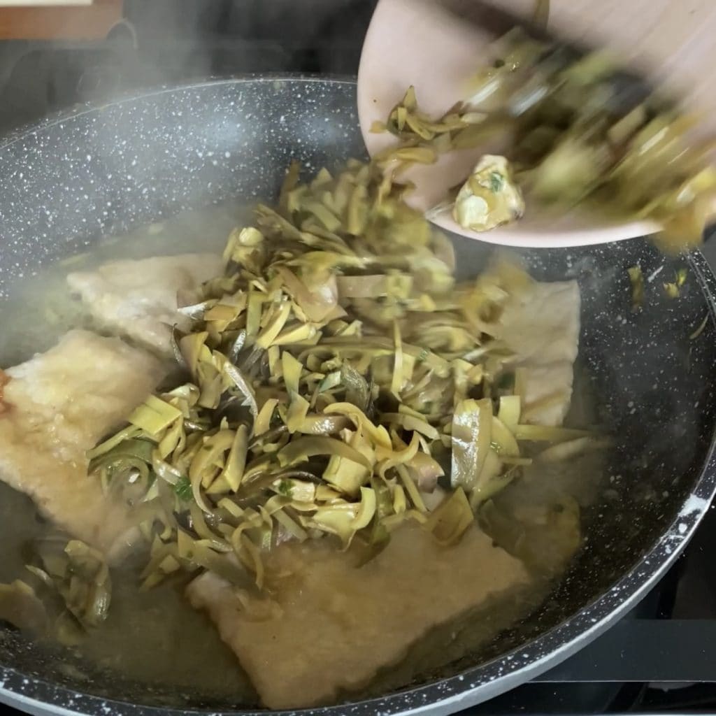 • geben Sie in die Pfanne, in der Sie die Artischocken gekocht haben, Butter und etwas extra natives Olivenöl,