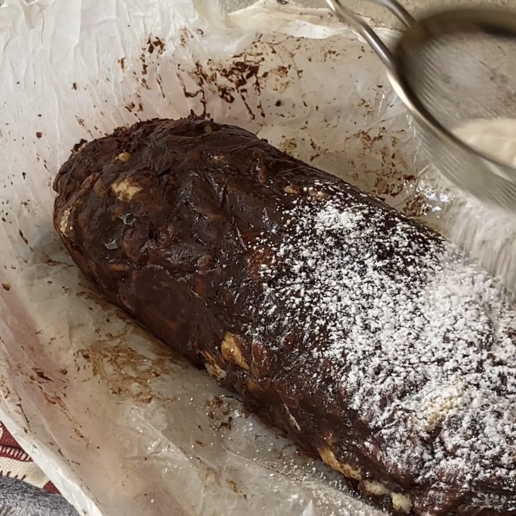 Holen Sie die Schoko-Salami ohne Ei und Butter heraus und bestäuben Sie sie mit Puderzucker, um das Aussehen einer echten Salami zu simulieren, alternativ können Sie Kokos oder bunte Streusel verwenden.