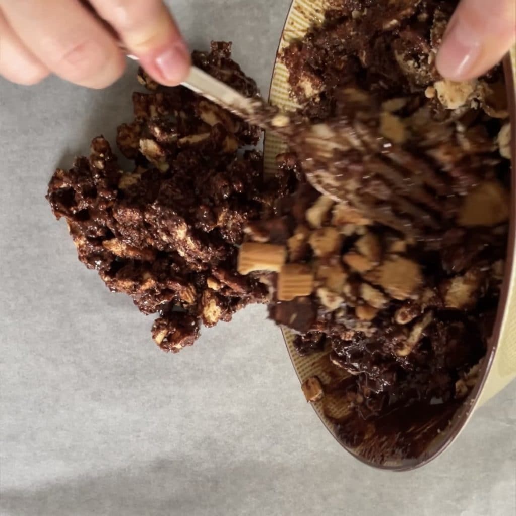 Fügen Sie die zerkrümelten Kekse hinzu, nach und nach, und fügen Sie die nächste Portion hinzu, wenn Sie sehen, dass die Kekse in die Schokolade eingearbeitet sind.