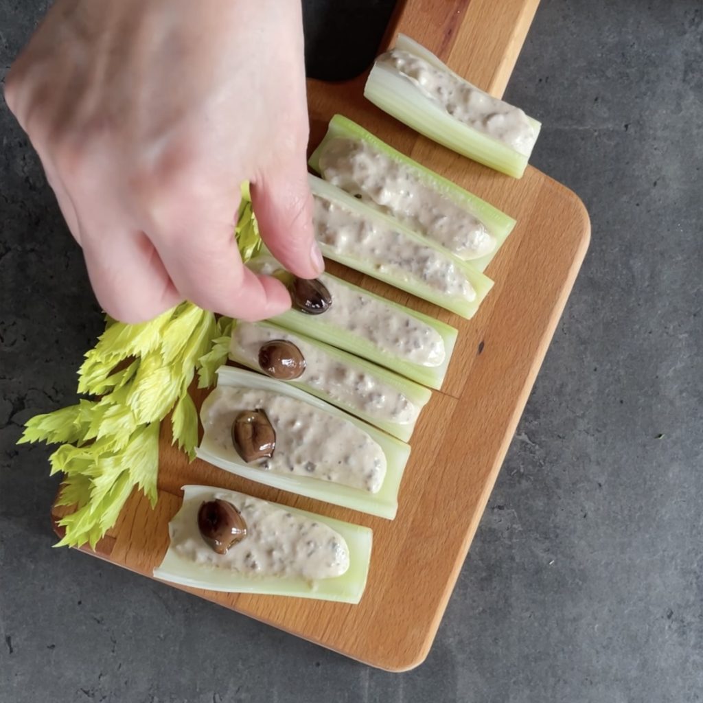 richten Sie dann die Selleriebötchen auf einem Servierteller an, ich habe sie auf einem Schneidebrett angerichtet und serviert, füllen Sie jedes Selleriestück mit der Thunfischsauce
