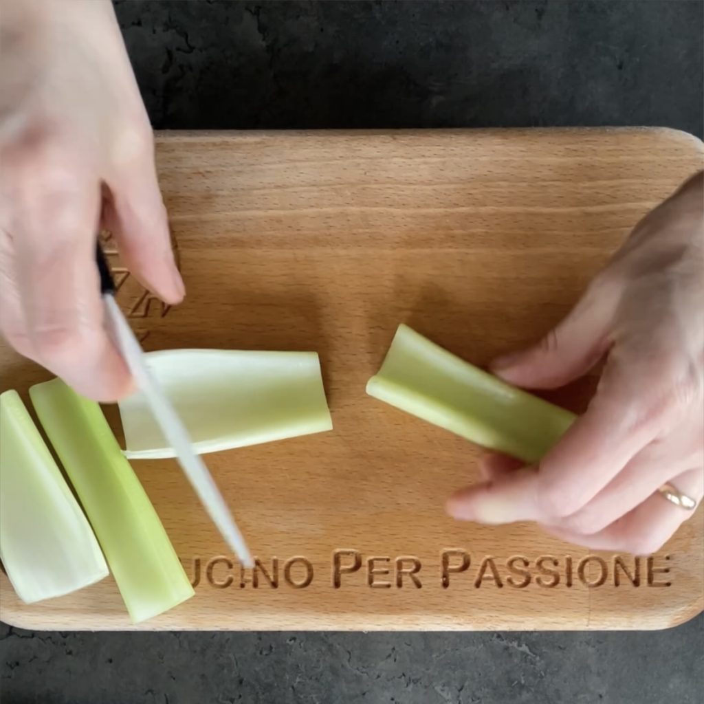 Reinigen Sie den Sellerie, verwenden Sie die zarten Stangen, waschen Sie sie gut unter fließendem Wasser, entfernen Sie eventuell vorhandene Fäden und schneiden Sie sie in etwa 5 cm große Stücke.