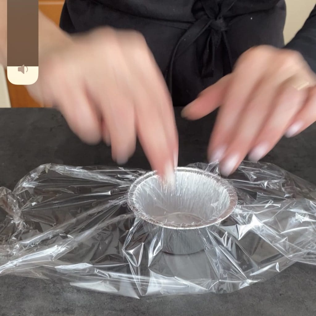 Legen Sie die Behälter mit Frischhaltefolie aus, damit Sie sie später leichter herausnehmen können, wenn sie gefroren sind.