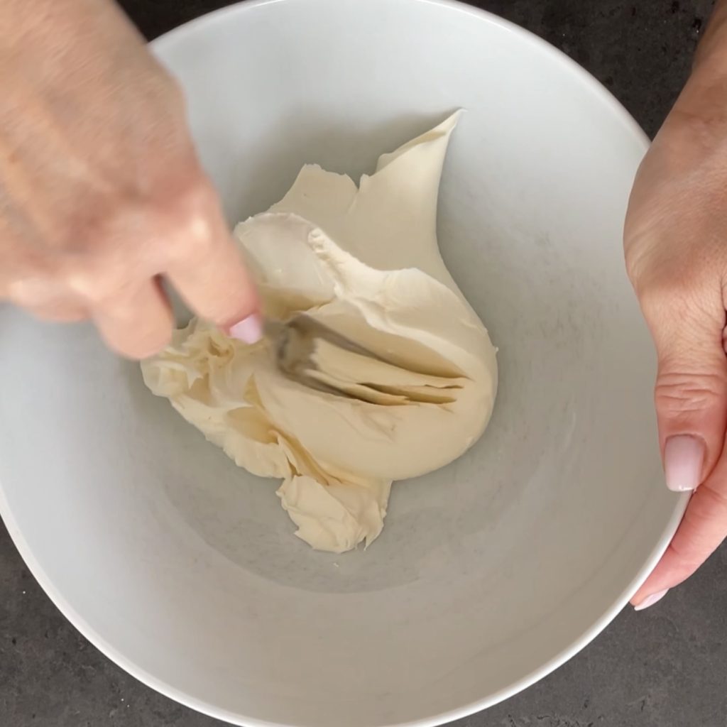 Geben Sie den Mascarpone in eine Schüssel und arbeiten Sie ihn zuerst mit einer Gabel