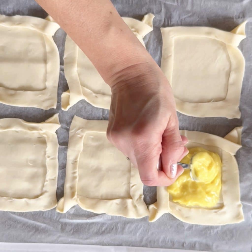 • Geben Sie in die Mitte jedes Rechtecks Vanillecreme, backen Sie sie im vorgeheizten statischen Ofen bei 180°C für 20 Minuten.