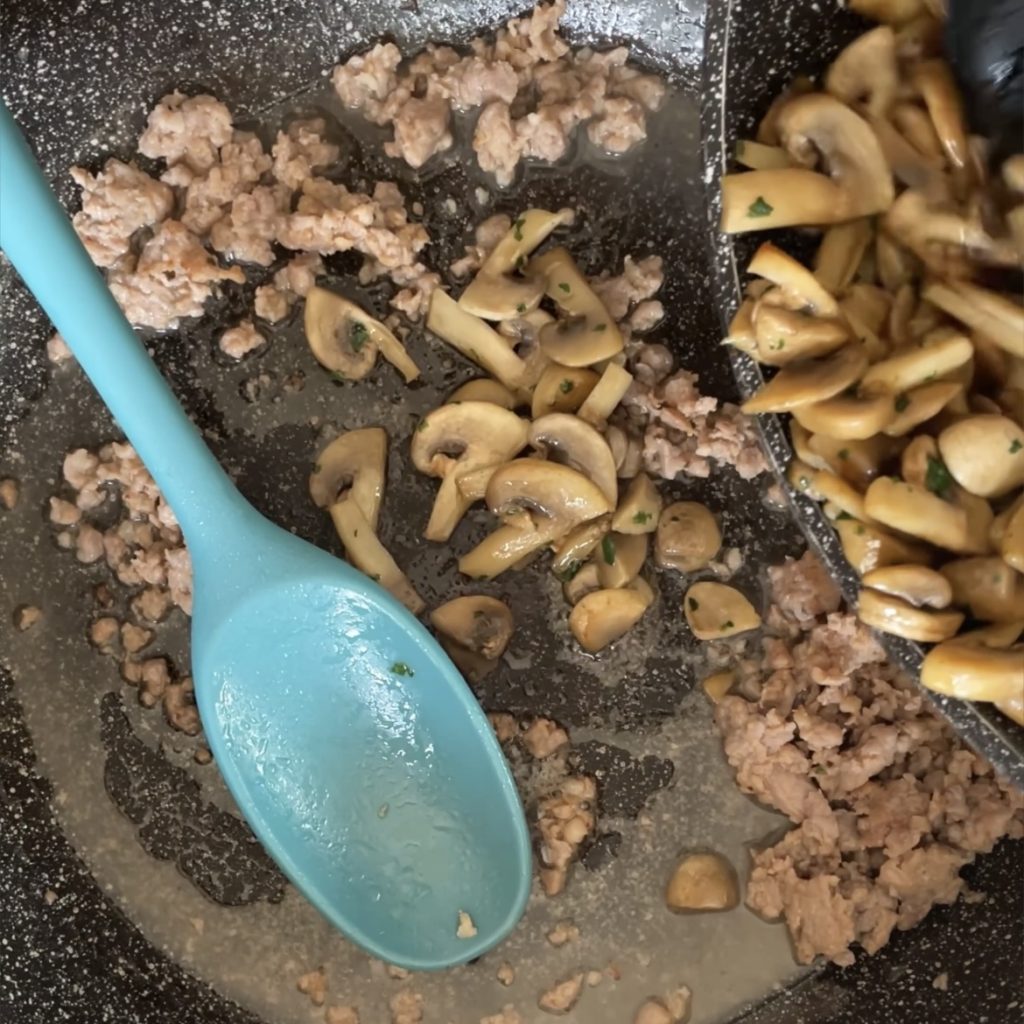 Wenn das Würstchen gut gekocht ist, geben Sie die inzwischen gekochten Pilze in die Pfanne und lassen Sie sie bei niedriger Hitze einige Minuten ziehen.