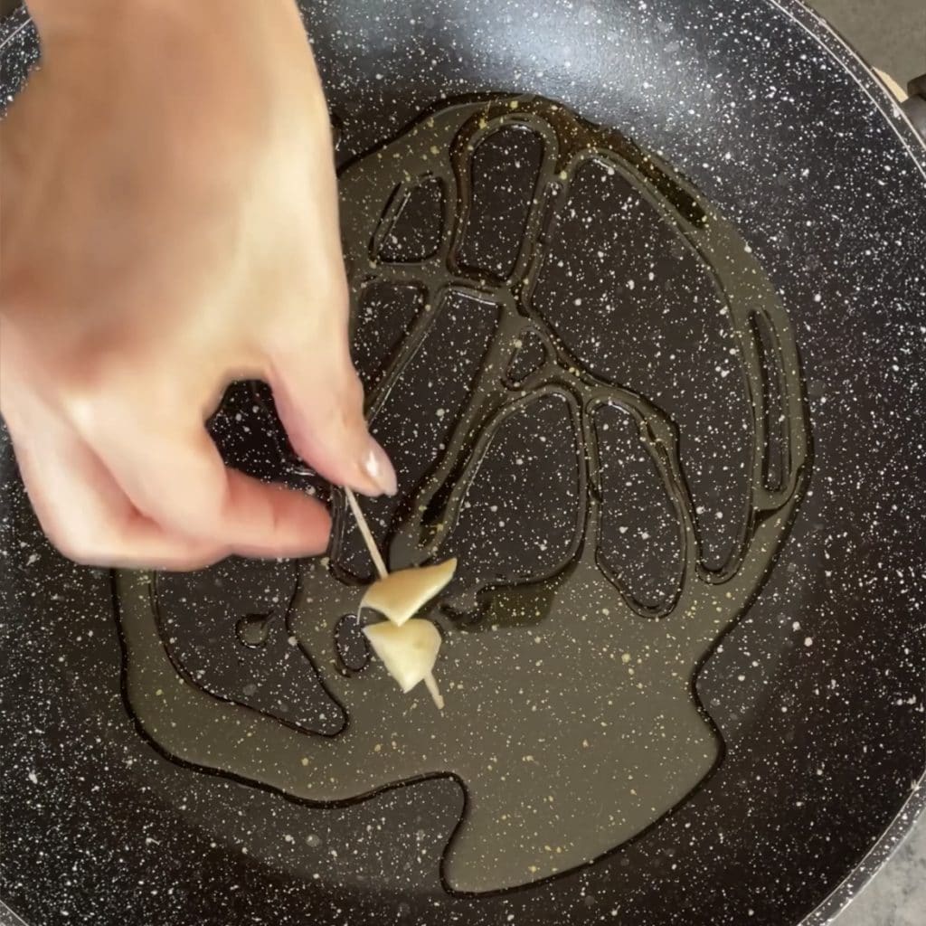 die Knoblauchzehe aufgespießt auf einem Zahnstocher, so können Sie sie später leichter entfernen.