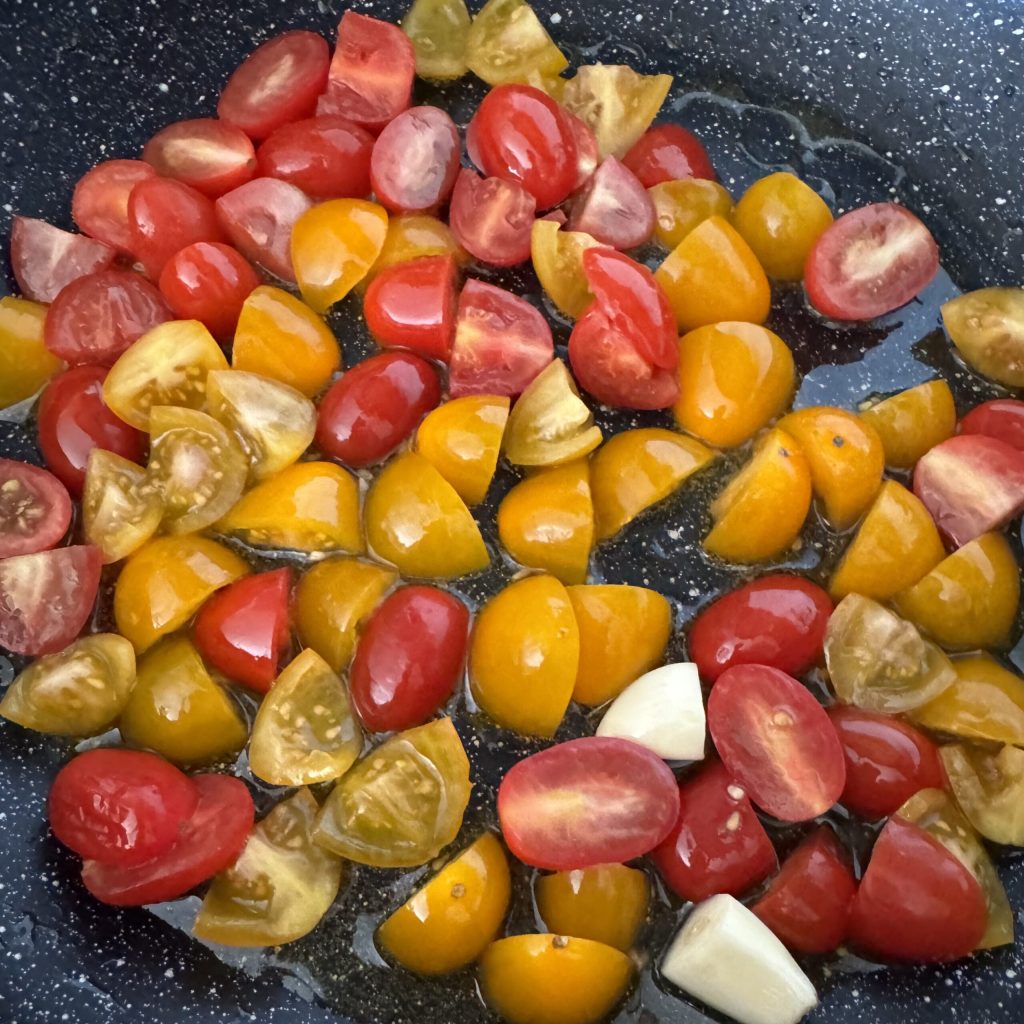 Bereitet jetzt die Sauce vor, wascht die Zucchini, schneidet die Enden ab und schneidet sie in einige Millimeter dicke Scheiben. Wascht auch die Kirschtomaten und schneidet sie in Hälften oder Viertel, wenn sie groß sind.