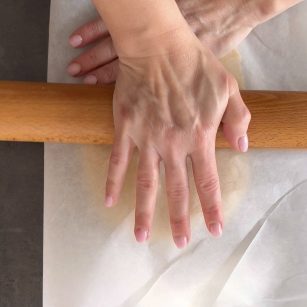 Rollen Sie den Mürbeteig zwischen zwei Backpapierblättern aus und lassen Sie ihn 30 Minuten im Kühlschrank ruhen.